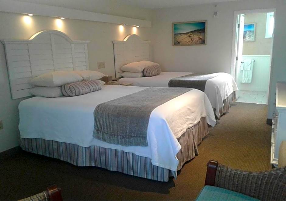 The two bedroom suite is located in the Garden House, which is located behind the Towers building across Shore Road from the ocean. The Garden House suite is a two-bedroom unit with a queen bed and a full bathroom in each bedroom. In addition the suite has a common room with a living area and a junior kitchen.